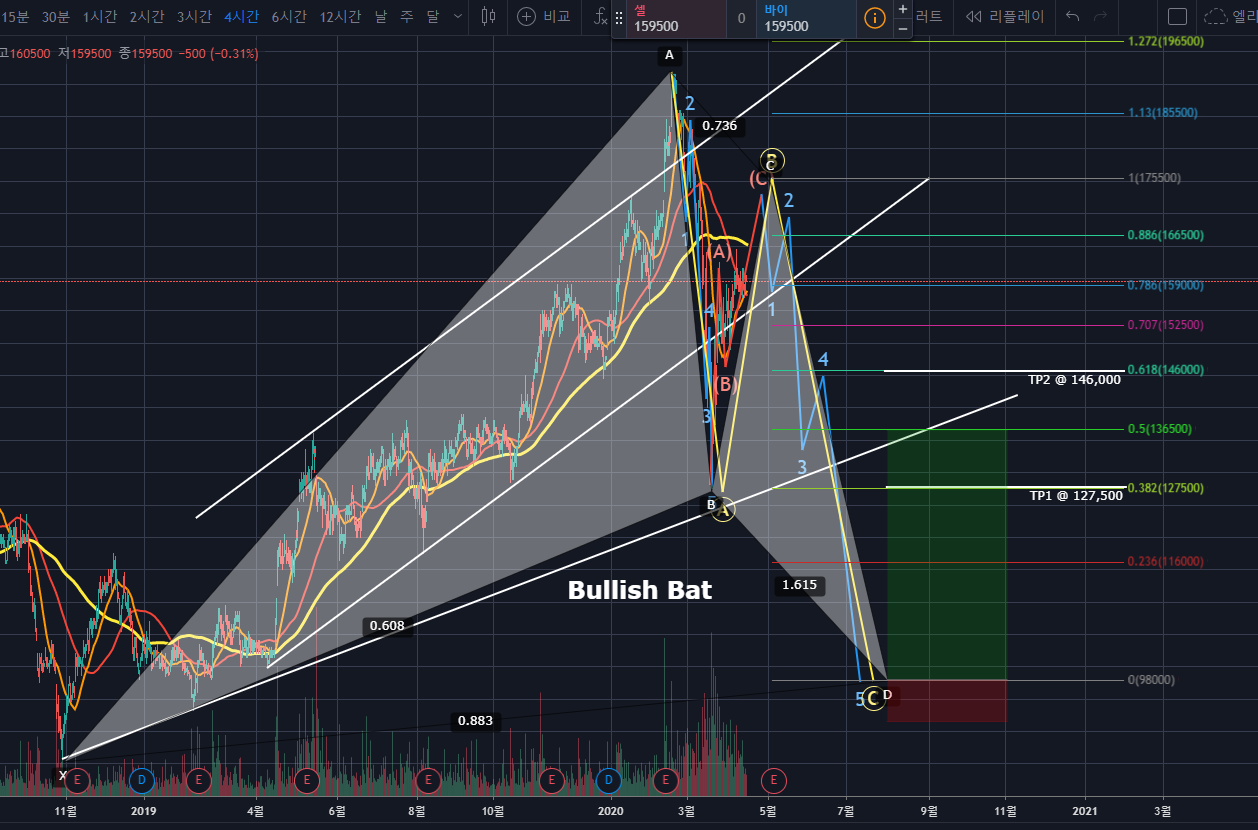 카카오는 피보나치 0.5 되돌림에서 반등한 것으로 보아 Bullish Bat Pattern이 나오지 않을까싶습니다. C포인트까지 상승 후 0.886(XA)까지 하락하게 된다면 1AB=CD도 만족할 것으로 보이기 때문이며, 뒤에 언급할 엘리엇 웨이브관점에서도 Bullish Bat Pattern의 PRZ는 좋은 반전자리로 보이네요.