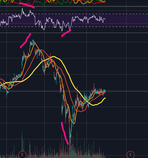 위의 차트를 보면, 하락 시 임펄스 5파로 하락한 것으로 보여집니다. 하락하면서 거래량 또한 증가하였네요.