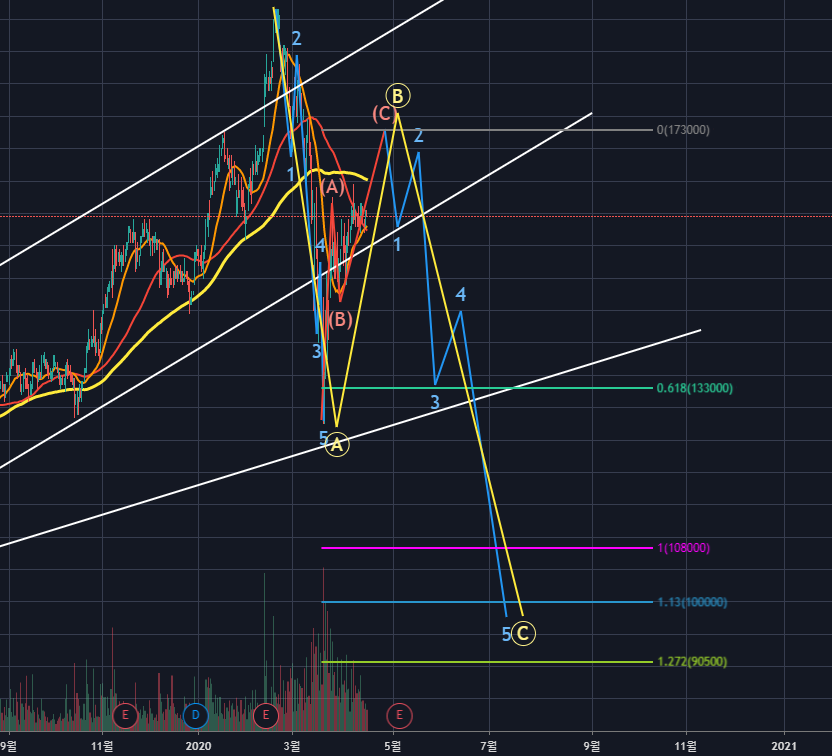 이후 B파 반등하는 지금 거래량이 줄어들고 있습니다. RSI분석 때 말했듯, 여기서 조금 더 상승한다면 히든 하락 다이버전스가 생기면서 B파를 완성할 것으로 보여지네요. 이후 임펄스 하락 5파동이 강하게 나오면서 ABC 1:1비율 혹은 1:1.3 비율로 하락할 것으로 보여집니다.