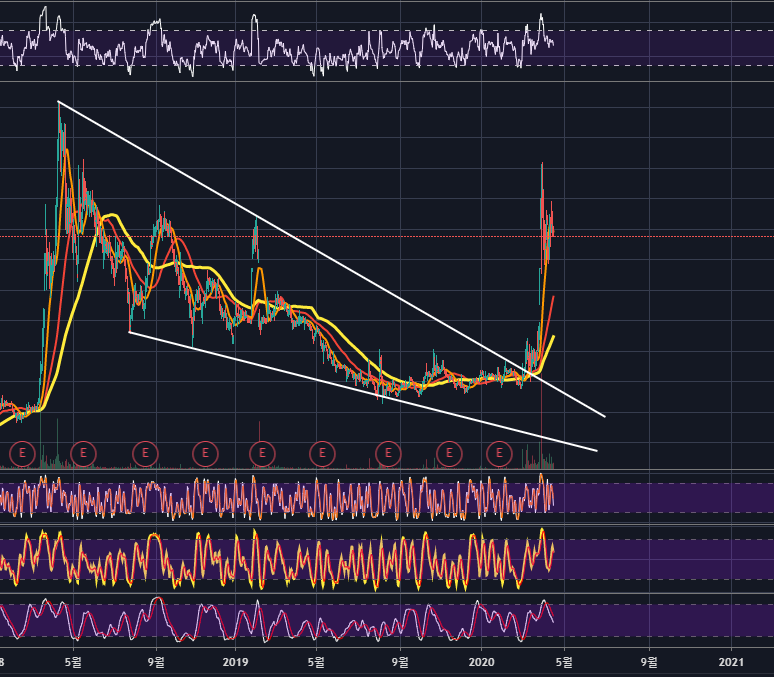 18년 4월부터 진행된 폴링웻지 패턴을 거래량을 가지며 상향돌파한 주가는, 정배열까지 완성되며 큰 상승을 하였습니다.