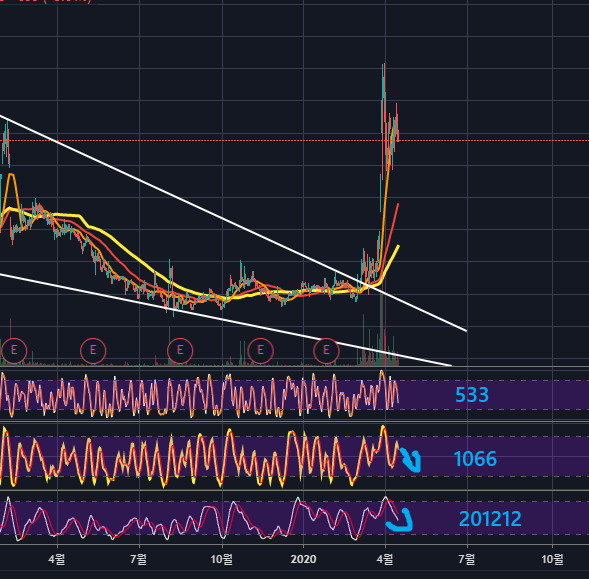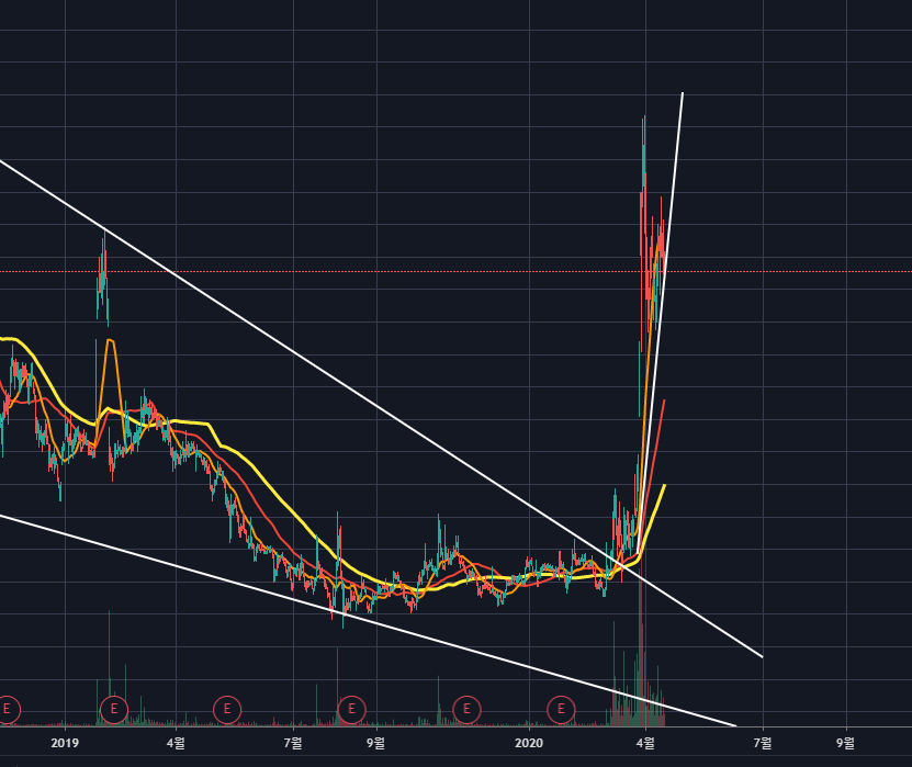 이후 이평선이 수렴하며 횡보를 하다가, 폴링웻지 상단선을 거래량 가지고 돌파하며 주가가 급등하기 시작하였습니다.