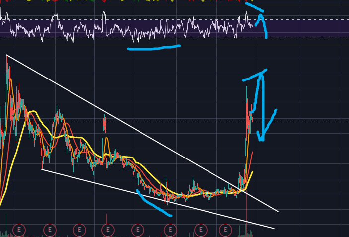 이후 이평선이 수렴하며 횡보를 하다가, 폴링웻지 상단선을 거래량 가지고 돌파하며 주가가 급등하기 시작하였습니다.