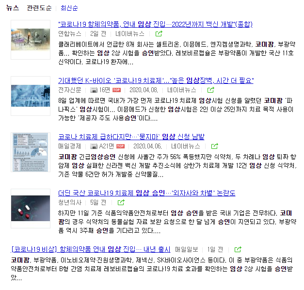 위의 뉴스를 보면 코로나 백신개발에 뛰어든 제약회사들의 임상승인이 빠르게 나는 것이 아니라, 시간이 꽤나 걸릴 것으로 보여지네요. 묻지마 임상 신천이 남발한다는 내용도 있으며, 2020년까지 백신 개발이라는 등 한두달내에 뚝딱 이뤄질 것만 같았던 코로나 치료제는 아직도 꽤나 시간이 필요해보입니다. 이와중에 코미팜은 사이토카인 폭풍을 억제시킬 수 있는 바이러스 감염 염증치료제인 임상약 파나픽스 개발에 성공했으며, 코로나19 페렴환자를 대상으로 긴급임상을 실시할 계획이라고 16일 밝혔습니다. 또한 자회사인 미코바이오메드가 코로나19 진단시스템 수출을 시작하였다고합니다.