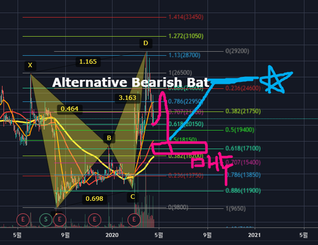 Alternative Bearish Bat패턴의 TP2가 17,100원인데, 이곳까지 조정을 준 후 반등한다면 더할나위 없을 것 같습니다.