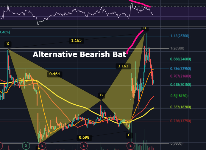 위의 4시간봉 차트와 같이, Alternative Bearish Bat Pattern이 식별되었습니다. 0.382 B포인트에서 반락한 후 1.13 (XA)에서 PRZ를 구성하여 떨어지고 있는 모습입니다. PRZ에서는 4시간봉에서 일반하락다이버전스가 생성되면서 하락에 대한 신뢰도륵 대폭 증가시켜주었습니다. 이 자리는 매매를 하던분들은 반드시 익절하고 나왔어야 하는 자리입니다. 비단 하모닉패턴의 PRZ가 아니더라도 4시간봉 정도에서 일반하락다이버전스가 나온다는 것은 매우 심각한 것이기 때문입니다. 리스크를 안고갈 필요가 없죠.