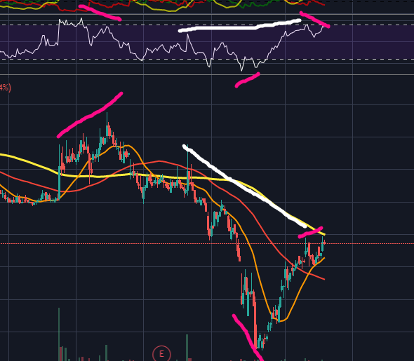 지금 자리에서 4시간봉에서는 희미해보이지만 1시간이나 30분 봉에서 보이는 일반하락다이버전스가 생성되었으며, 하얀색 선으로 그은 히든하락다이버전스 또한 적용되어있습니다.
