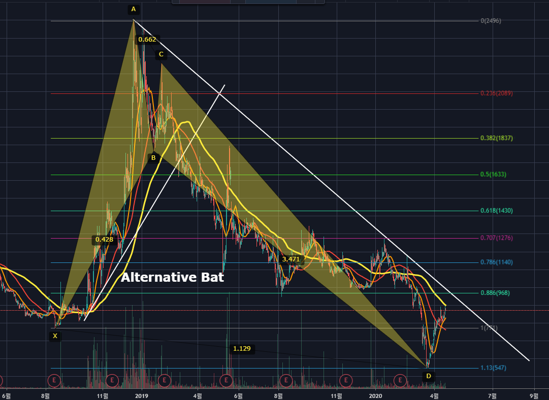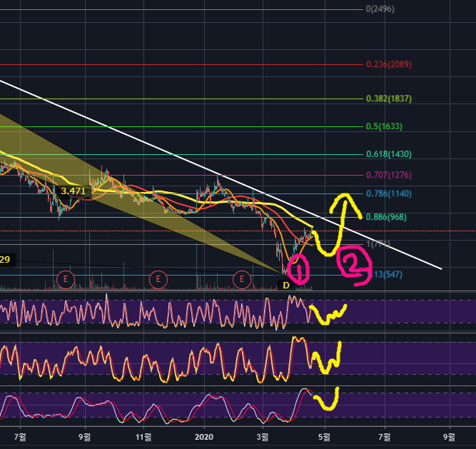 이렇게 된다면 TP1인 1190~TP2인 1600까지 상승할 수 있겠네요. TP1까지만 상승한다고해도 2019년부터 내려온 하락추세선을 강하게 돌파하는 것이기에 추세의 반전을 할 것으로 보여집니다.