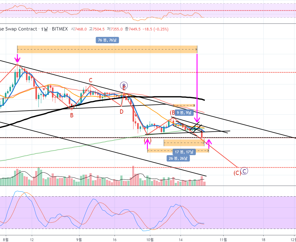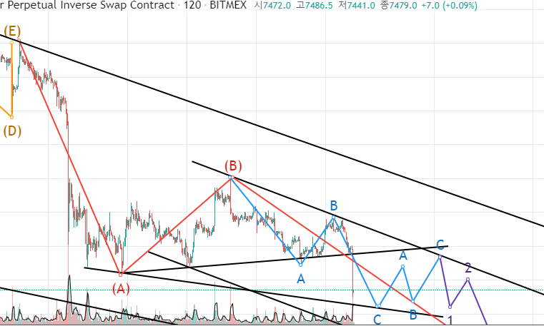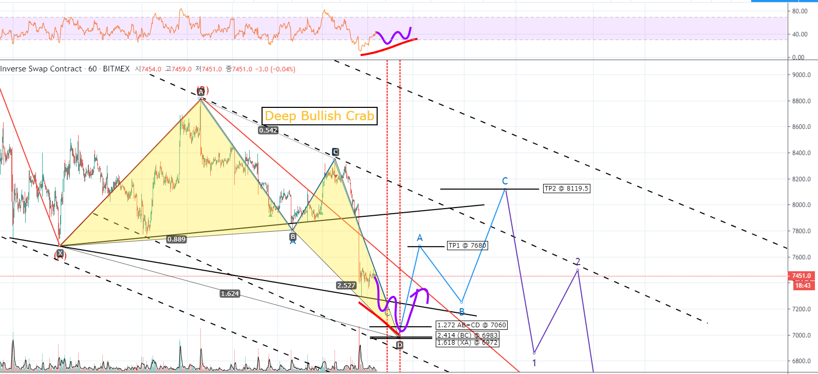 이렇게 된다면, 하모닉 패턴 전에 올린 엘리엇 웨이브 관점에서, 파란색의 ABC의 저점이 7200대에서 끝나지 않고, 재차 하락 후 반등할 수 있는 추가 관점이 생깁니다.