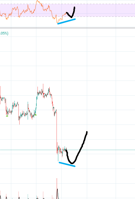 26일 경 저점이 확인된다면, 매수하기 좋으나 26일까지 저점을 갱신하며 일반 상승 다이버전스가 생성되지 않으면 롱보다는 오르면 숏을 잡겠다는 생각만 가지는 것이 좋아 보입니다.
