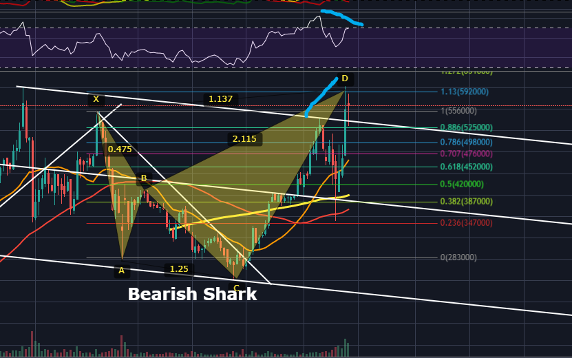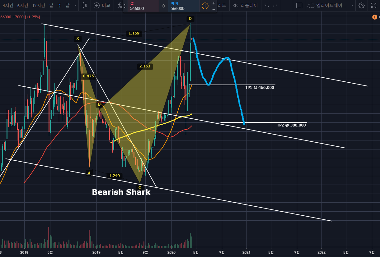 Tp인 466,000까지 1차 하락 후 반등하면서 채널링 상단에서 저항맞을 것으로 보이며, 이곳은 좌측 수평을 보았을 때 위꼬리가 3번 달린 곳이므로 매물이 강력할 것으로 보입니다.