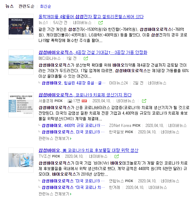 동학개미들이 셀트리온 헬스케어로 움직였다는 기사도 있가 있으며, 삼성바이오로직스가 4공장을 건설하여 코로나19 치료제 생산기지가 될 것으로 전망하는 기사도 있습니다. 또한 미국 기업 '비어 바이오테크놀로지'가 개발 중인 코로나19 치료제 후보물질을 국내에 위탁 생산하기로 했다는 내용도 있네요. 고점에서 호재료가 너무 많이 나오는 것 같습니다. 제가 매매를 해본바로는 고점에서 호재료가 나오는 것은 좋지 않은 현상입니다. 물량을 개미에게 떠넘기기 전 꼭 이런 시나리오로 흘러갔기 때문입니다.