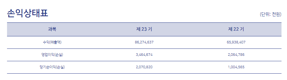 매출, 영업이익이 증가하였으며, 당기순이익이 큰 폭으로 증가하였네요.