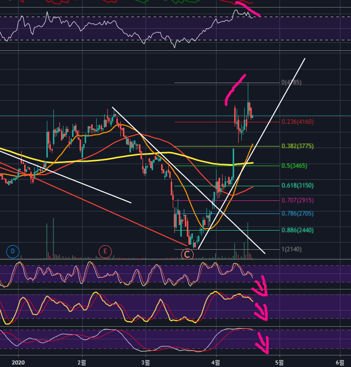 위꼬리가 긴 양봉이 나온 후 음봉이 출현하고 있는데요, 이평과의 이격도가 크고 일반 하락다이버전스의 영향으로 하방압력을 많이 받고 있는 상태입니다. 또한 스토캐스틱을 보더라도, 맨위의 533은 고점을 낮추는 쌍봉이 2연속 나온 상태이며, 1066은 고점을 낮추는 쌍봉이 나오고, 201212 또한 고점에서 데드크로스가 나온 상태입니다. 스토캐스틱 533/1066/201212 세 가지 모두 하락이 임박했음을 보여주고 있습니다. 여기에서 하락한다면 상승하던 추세선을 하향돌파할 것으로 보이며, 피보나치 0.618 되돌림인 3,150원 정도까지는 하락할 여지가 있으니 보유물량이 있는 분들은 전부 청산 혹은 많은 비중을 줄이고, 신규 매수 대기자는 매수를 보류하고 조정을 기다리는 것이 좋아보입니다.