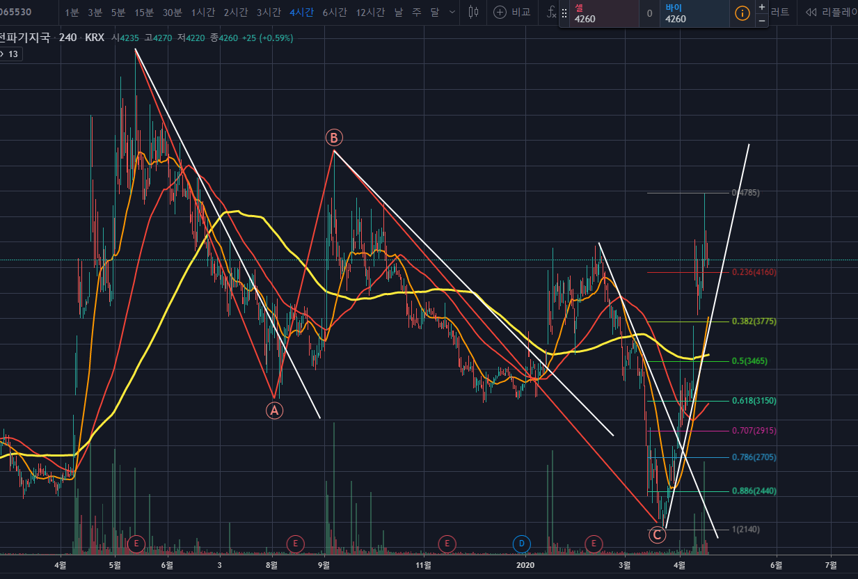 만약 조정을 건강하게 마무리하고, 조정한 후 상승시그널을 동반한 상승이 이어진다면 5,100원대까지는 무난하게 상승할 수 있어보입니다. 하지만 반드시 RSI 상승다이버전스나 스토캐스틱 양전환, 그리고 이평선과 엘리엇파동 등의 여러 복합적인 요소를 고려한 후 진입해야합니다. 0.786 피보나치 되돌림인 2,700원대까지 하락 후 5,100원대까지 상승한다면 88%가량 수익을 거둘 수 있는 것이네요. 절반은 중간지점에서 익절하고, 나머진 분할익절하며 올라가면 좋을 것 같습니다.