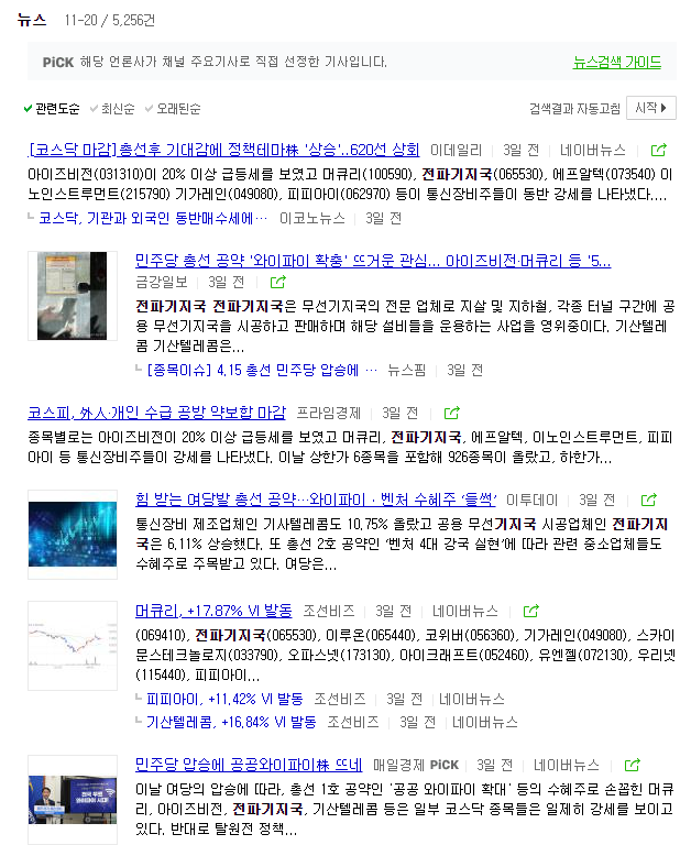 최근 전파기지국 네이버 뉴스를 참고하면, 전파기지국의 내부호재보다는 상승과 하락률에 따른 기사가 많습니다.