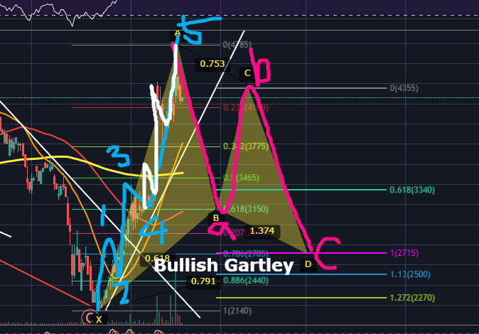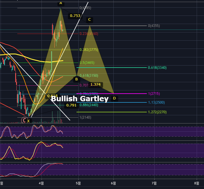 현재 식별되는 하모닉패턴은 보이지 않습니다. 하지만 현재 조정추세가 진행되고 있다는 관점에서 RSI다이버전스, 스토캐스틱, 엘리엇웨이브를 고려하였을 때 0.618 B포인트 반등 후 C포인트 되돌림, 이후 0.786 (XA)에서 D포인트를 만들며 Bullish Gartley의 모양이 나오면 이상적이기에 저는 미리 그려놓았습니다. 보통은 이렇게 그림이 나오기 전에 그려 놓는 것은 어리석은 것이나, 저의 경우는 매매방법이 어느정도 틀이 생기고 추후 움직임까지 고려하다보니 이런식으로 미리 그려놓기도 하는 편입니다.