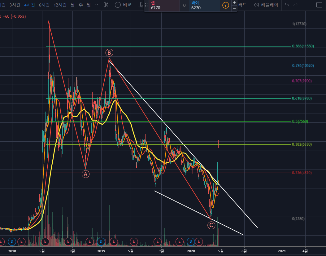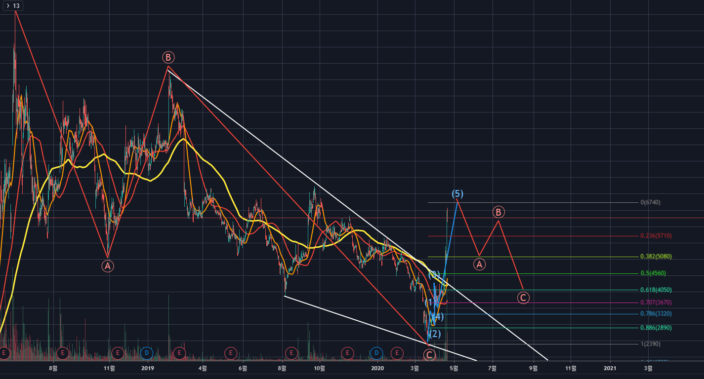 위의 차트를 보면, ABC 조정이 마무리 되고, 상승을 시작하고 있는 것으로 보입니다.