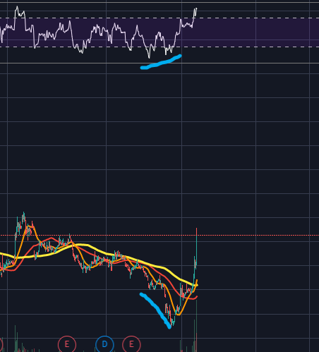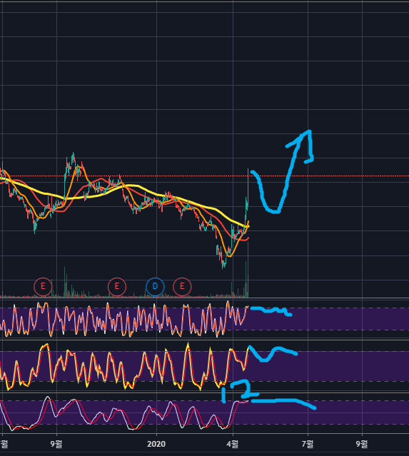 현재자리에서 눌린 후 재차 상승을 도모할 수 있어보이며, 그렇게 된다면 이평의 정배열이 나오면서 추세가 강하게 상방으로 쏠릴 것 같습니다. RSI는 지금 과매수상태이기에 추격매수하기에는 너무 위험해보이네요. RSI가 많이 식으며 조정이 올 때까지 기다리는 것이 좋아보입니다.