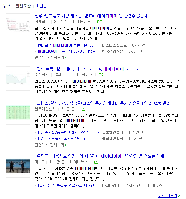네이버 뉴스를 확인해보면, 남북철도 연결사업에 관하여 대아티아이가 급부상 하고 있습니다.