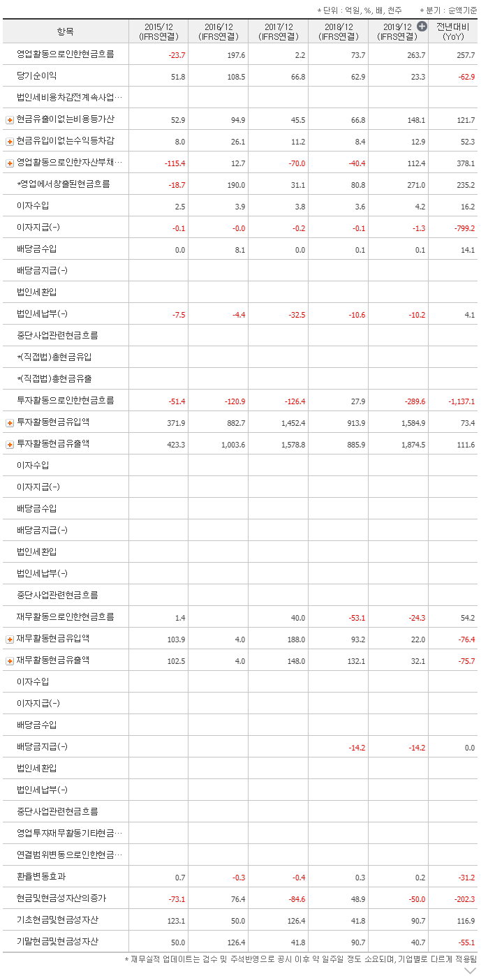 최근들어 현금흐름이 안좋아지는 것으로 보입니다. 마이너스인 항목이 대폭 늘었네요.