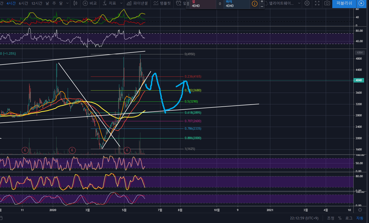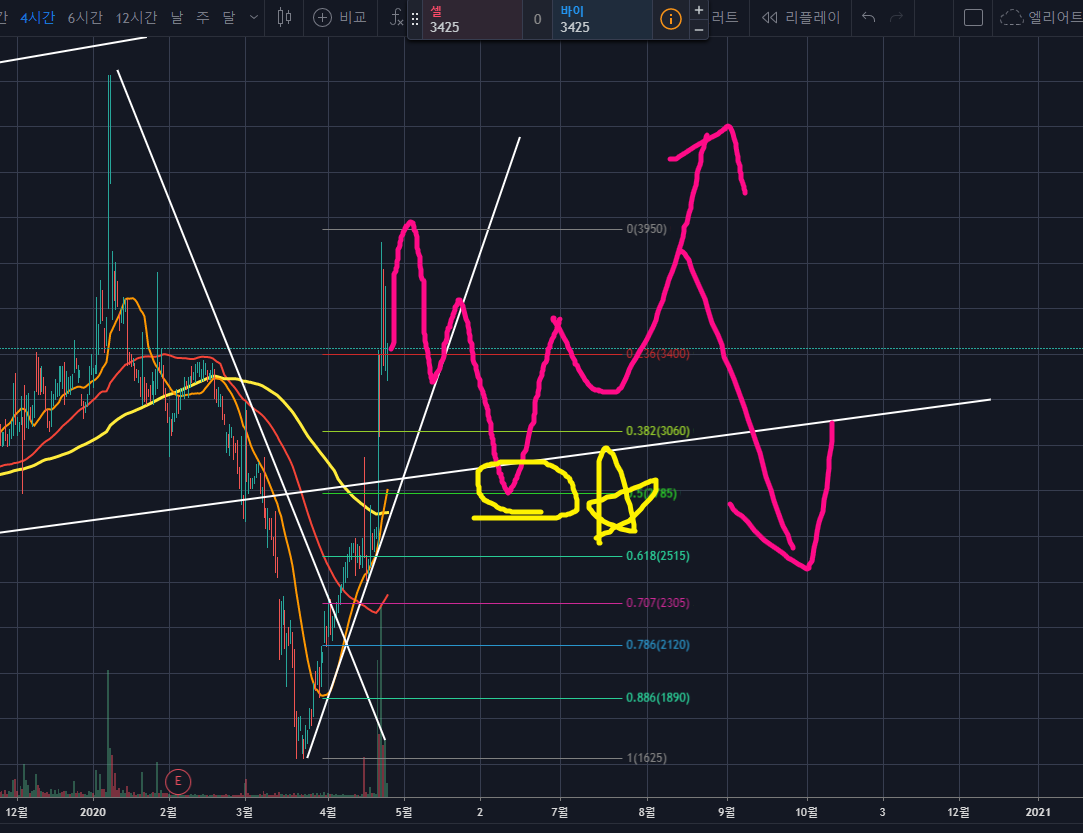 이것을 하향돌파한다면 급락이 나오면서, 저점과 고점의 피보나치 0.5~0.618되돌림까지는 급속도로 빠질 것 같습니다.