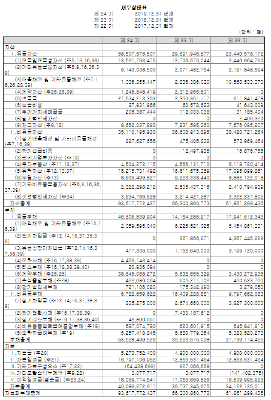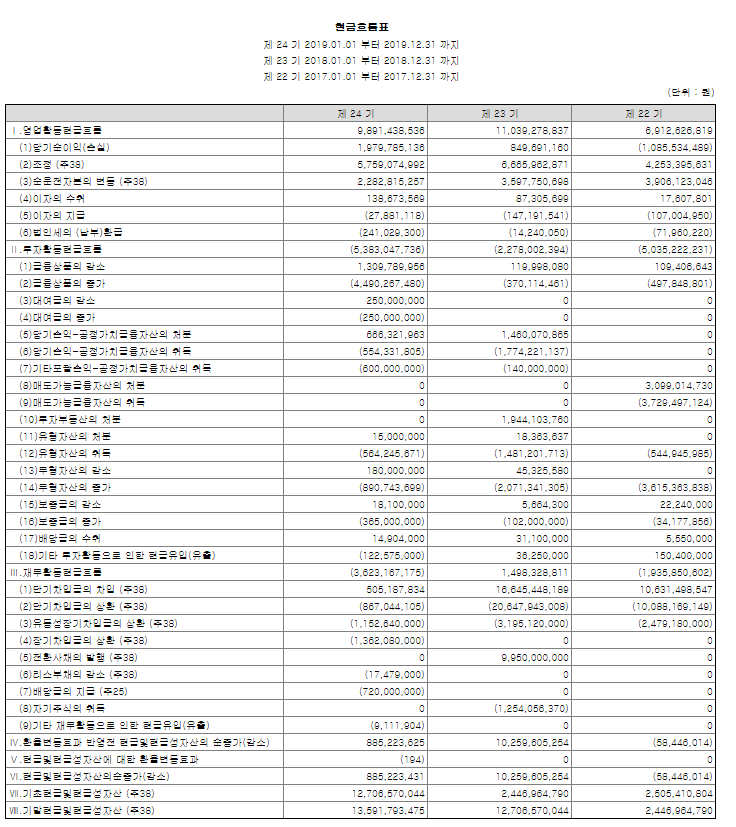 당기순이익이 압도적으로 늘어났네요. 이것은 좋은신호일 것 같습니다. 22기에는 부의 당기손이익(마이너스) 였는데 양23기 24기를 통해 양전환했네요.