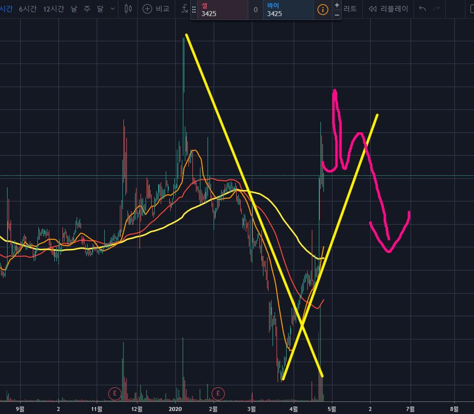그렇게 된다면 노란색 120이평정도에서지지받은 후 횡보->급등의 시나리오로 갈 수 있겠습니다.