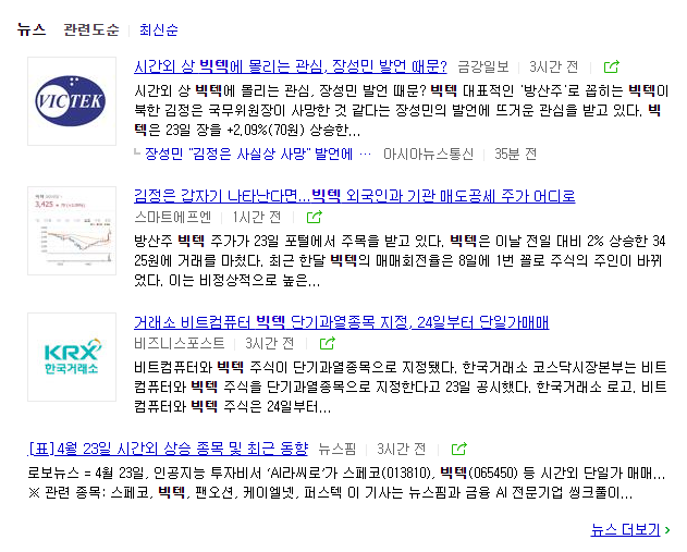 빅텍 주가가 최근 급등한 모습입니다. 코로나19가 유행하는 요즘, 장성민이 김정은의 사망설을 얘기했기 때문인데요.