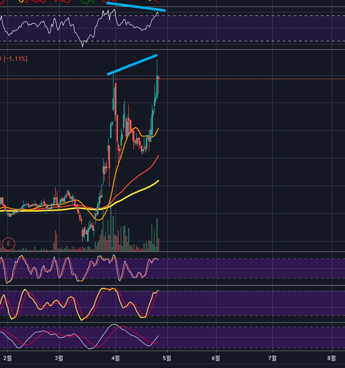 주황색 20이평 또한 주가가 높아졌음에도 좌측보다 고점이 상승하지 않았네요.