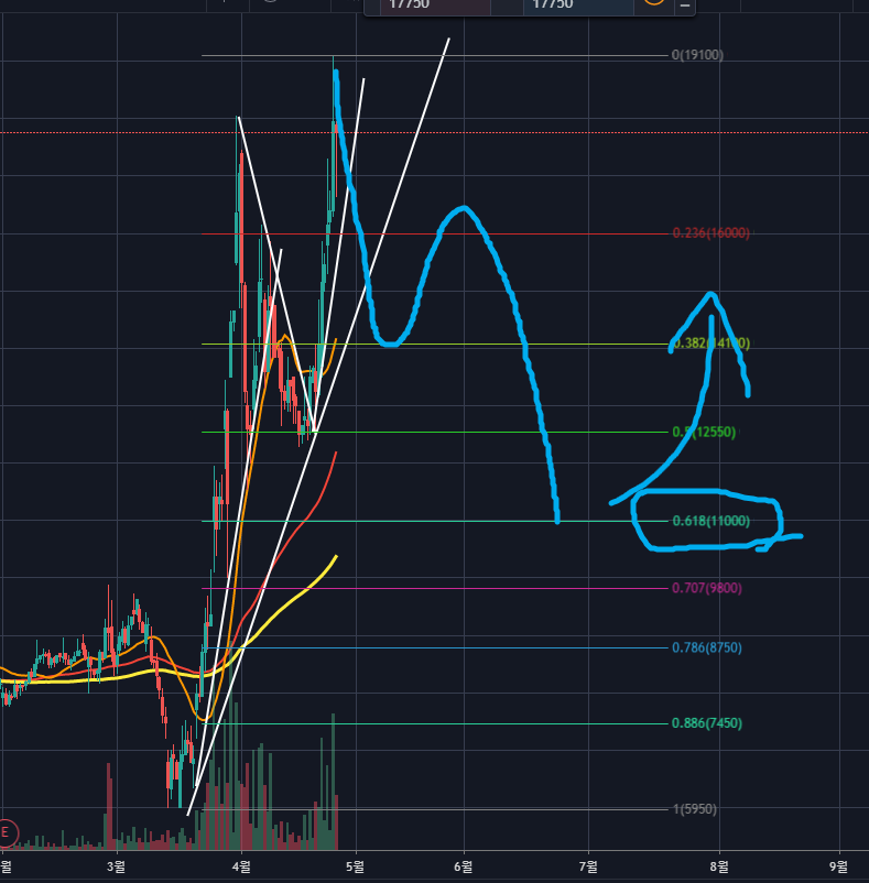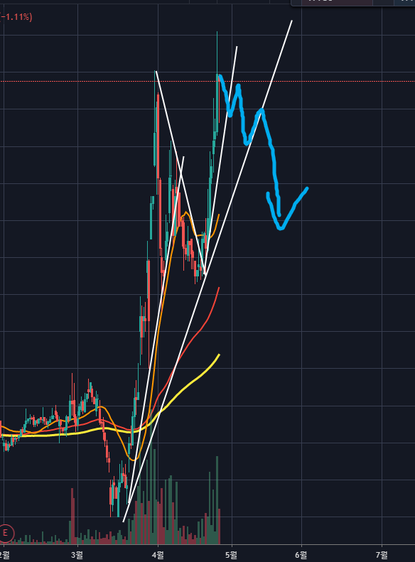 큰 조정이 나올것으로 보이네요. 하락폭은 노란색 120이평이 있는 가격즈음이 되지 않을까 싶습니다.