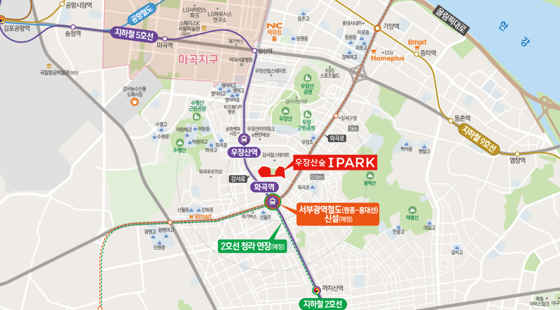 우장산숲 아이파크는 화곡옆과 우장산역 사이에 위치하여 있으며, 2호선 청라(예정)과도 인접해있습니다.