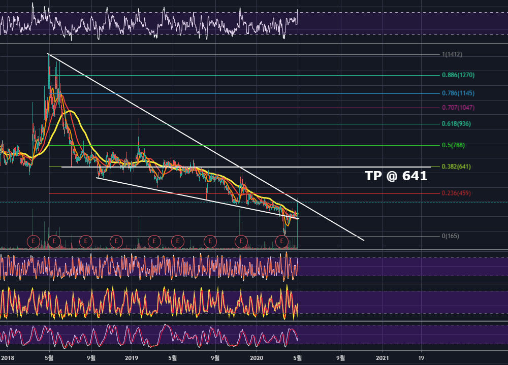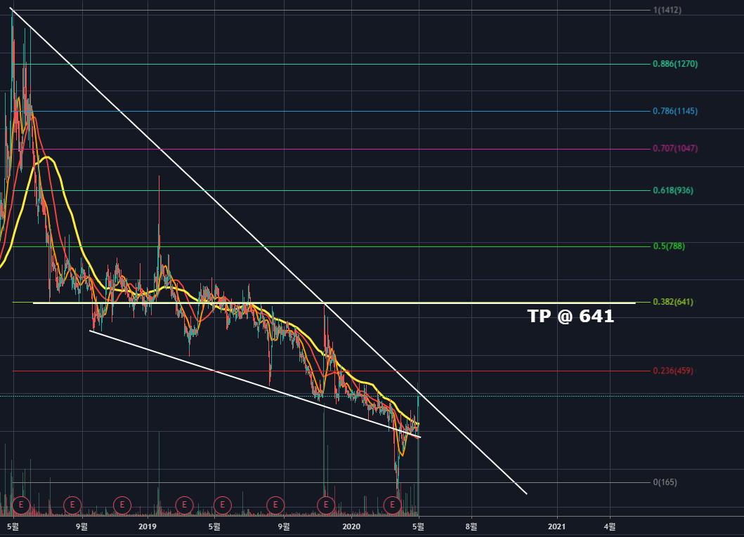 목표주가는 고점과 저점의 피보나치 0.382되돌림인 641원이며, 해당구간은 좌측에서 보면 지지와 저항을 유독 많이 받은 자리라고 볼 수 있습니다. 매물대가 많이 형성되어있기 때문에 안정적으로 해당구간에서는 전량 익절 혹은 70%익절 후 나머지는 홀딩하는 방법이 좋아보이네요.