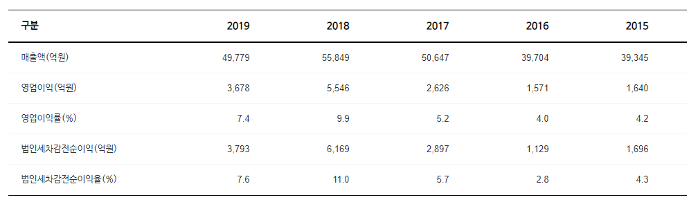 17년과 18년의 실적은 전년대비 계속 상승하였으나, 19년 실적은 상대적으로 떨어졌습니다.