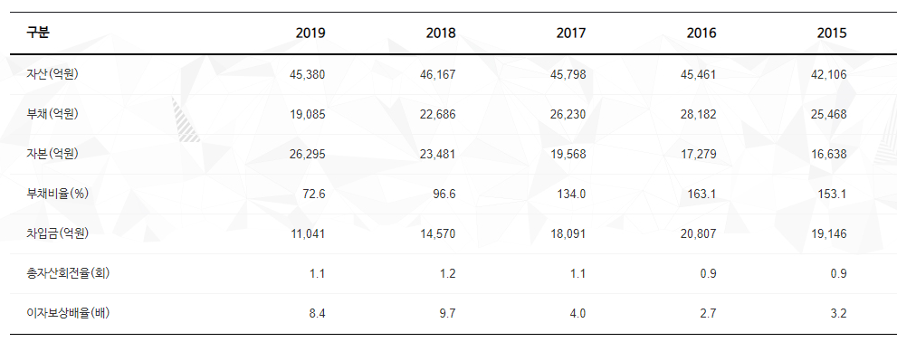 자산과 부채가 감소하였지만, 부채의 자산대비 비중이 아직도 42%나 됩니다.
