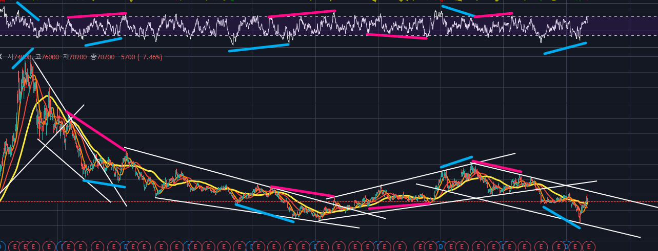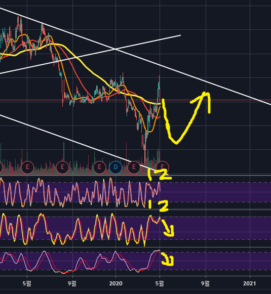 현재는 하락채널링 안에서 주가가 움직이고 있는 것으로 보입니다.
