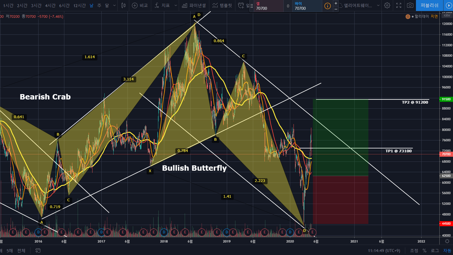 그렇게 된다면 Bullish Butterfly의 0.5피보나치 되돌림에서 50%의 물량을 익절매한 후, TP2인 91,200원에서 전량 익절매 하는 것이 좋아보입니다.