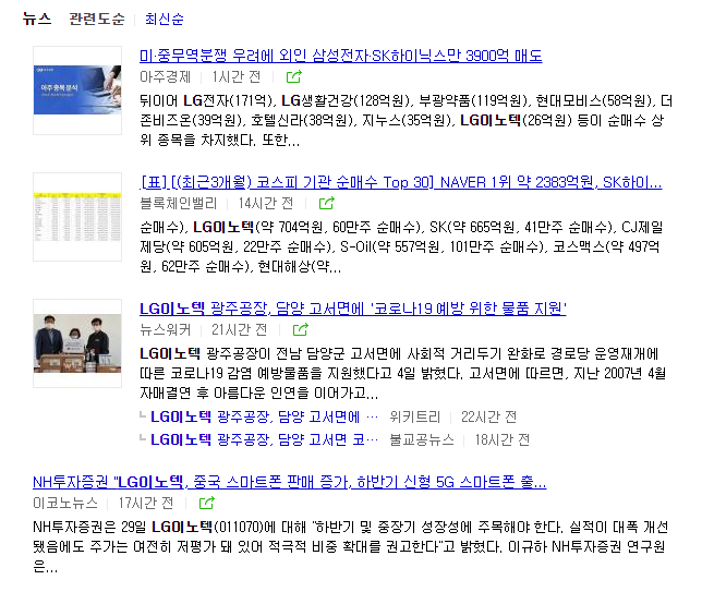 LG이노텍 최신 뉴스를 보면, 최근 순매수 상위 종목을 차지했다는 내용이 있습니다.