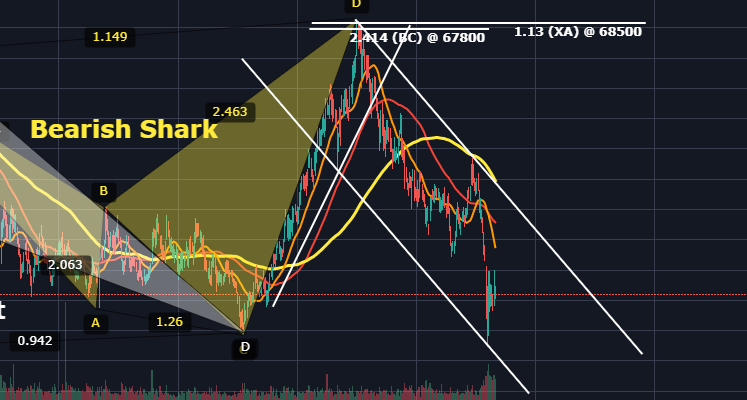 이후 Bullish Bat Pattern의 A포인트에서부터 내려오던 주가는 노란색의 Bearish Shark pattern을 만들었습니다.