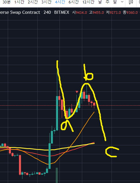 이렇게 하락한다면 4시간 빨간색 60이평, 노란색 120이평의 자리에서 지지받을 것으로 보여지며, 이 자리가 ABC 1:1익스텐션 자리이며,