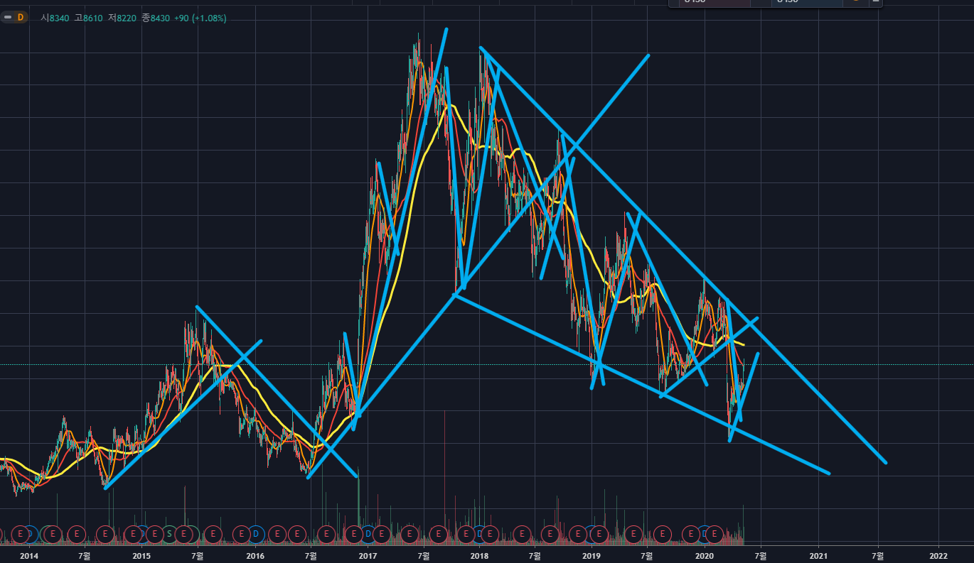 17년 6월 1만8천원대의 고점을 달성하였으니 1년만에 260% 상승을 한 것이네요. 이후 큰 하락을 한 후 큰 반등을 하였지만 고점을 갱신하지 못한 후 하락반전을 하였기에 실망매물도 쏟아지면서 하락추세로 전환되었습니다.