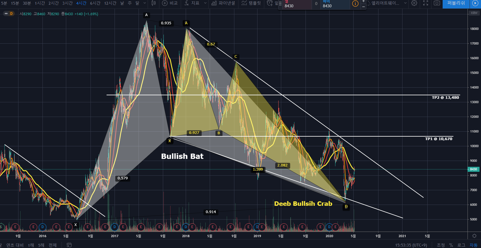 에스엠코어의 목표주가는, 두 하모닉패턴의 TP1인 10,670원 정도가 우선이며 여기에서 50%의 물량을 익절매 했다면,