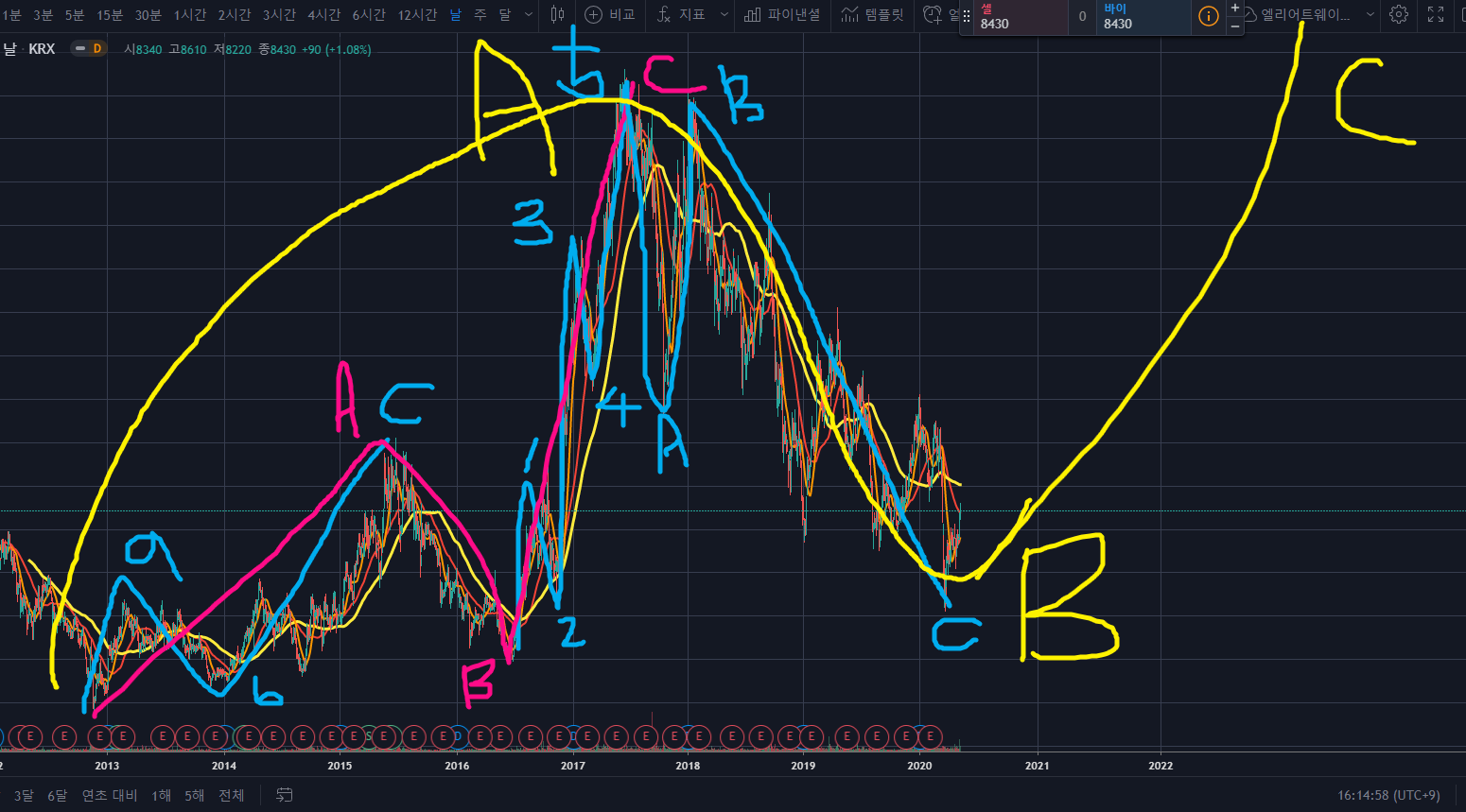 이후 노란색 B파동에서 파란색 ABC파동이 나왔으며, 이제 노란색 C파동이 시작되고 있음이 보입니다.