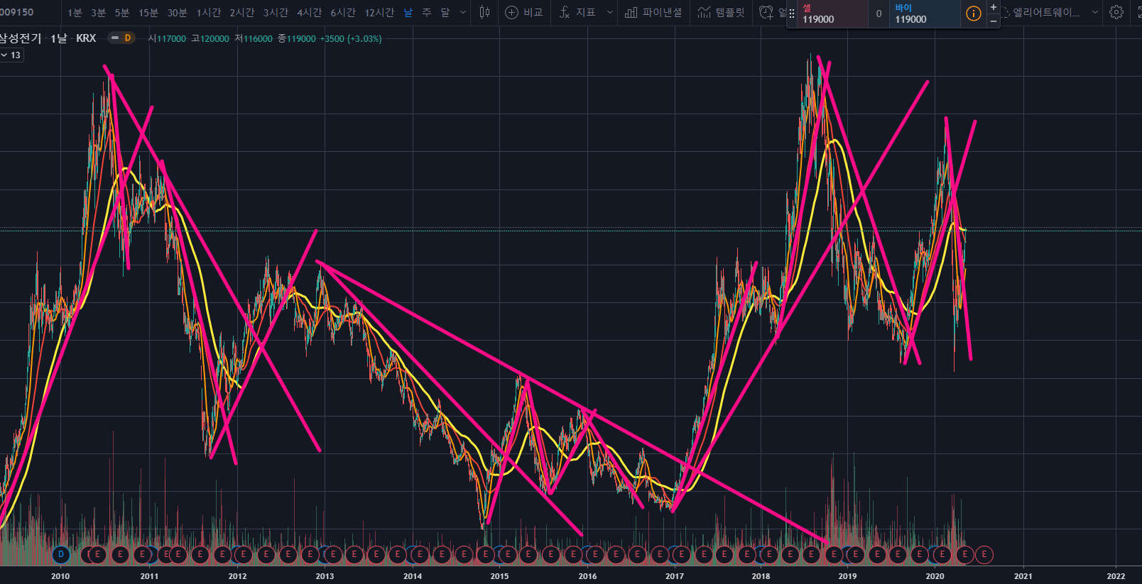 삼성전기 추세선을 보면, 정말 칼같이 지켜준 것을 볼 수 있습니다.