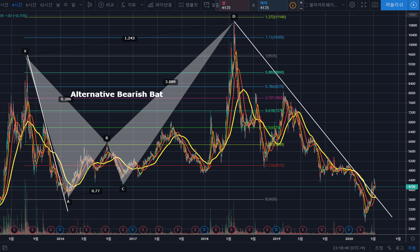 이제야 하락추세선을 상향돌파시도가 나왔습니다.최근 패턴에서는 따로 하모닉패턴이 발견되지 않는군요.