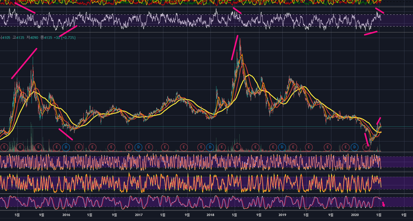 눌린 이후를 보면, 노란색 이평선정도에서 지지받고 상승할 수 있어보이며,