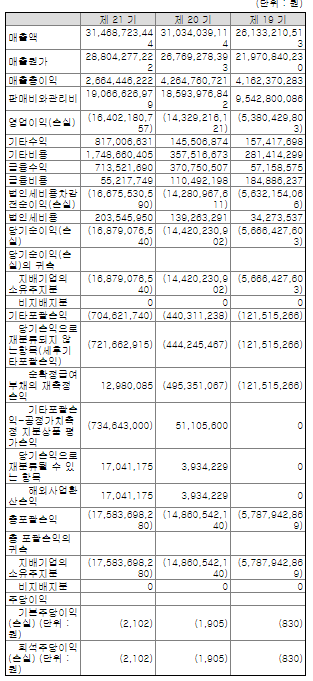 매출은 소폭 증가하였으나, 영업이익과 당기순이익이 계속해서 마이너스 성장 중입니다.