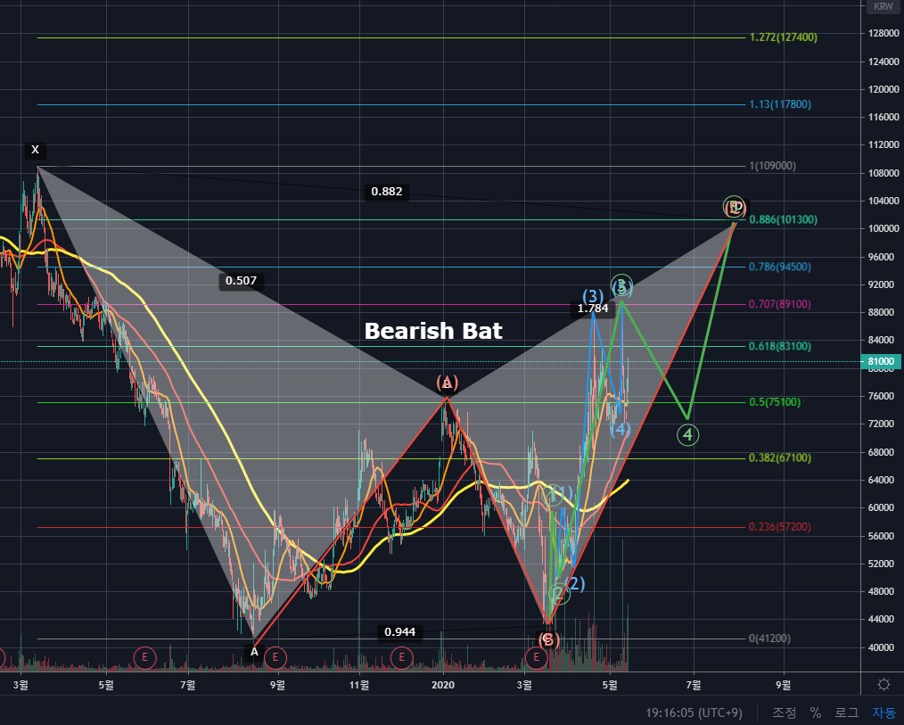 75,000원 주변에서 횡보 후 파란색 5파동의 상승을 하여 101,300원까지 상승한 후 Bearish Bat의 PRZ를 만족시키며 하락할 것으로 보이네요.