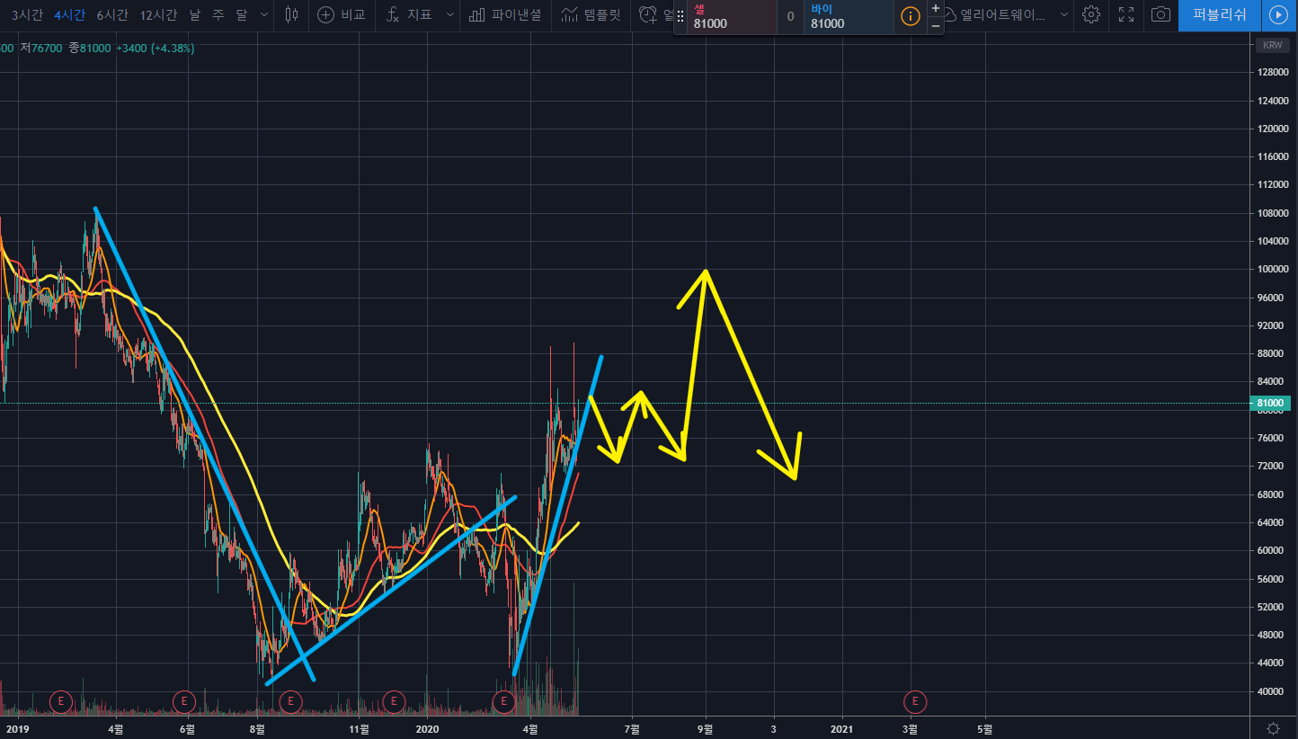 하지만 저는 우선은 이전 하위파동 4파 지지받았던 72,000부근 부터 분할 매수를 진입하는 것은 어떨까싶네요. 4파 삼각수렴 횡보 후 추진파동으로 5파를 찍고 급격한 조정이 나올 것 같기 때문입니다.