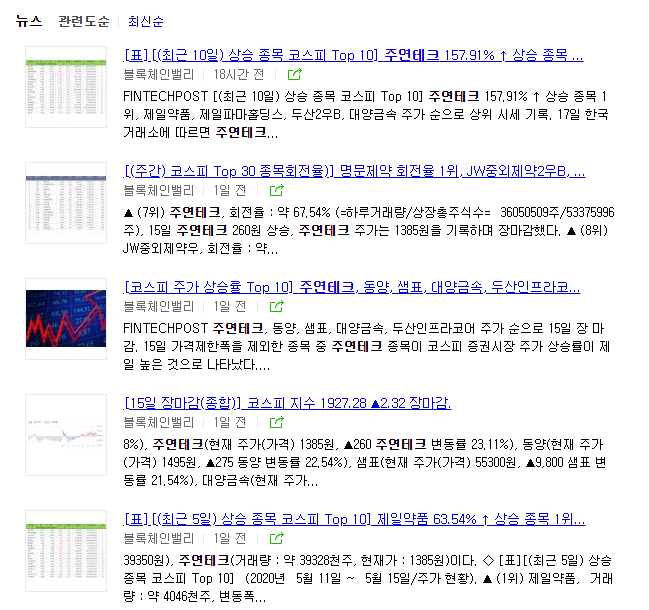 주연테크 뉴스를 보면, 최근 상승하는 종목에 포함된 것을 볼 수 있습니다.