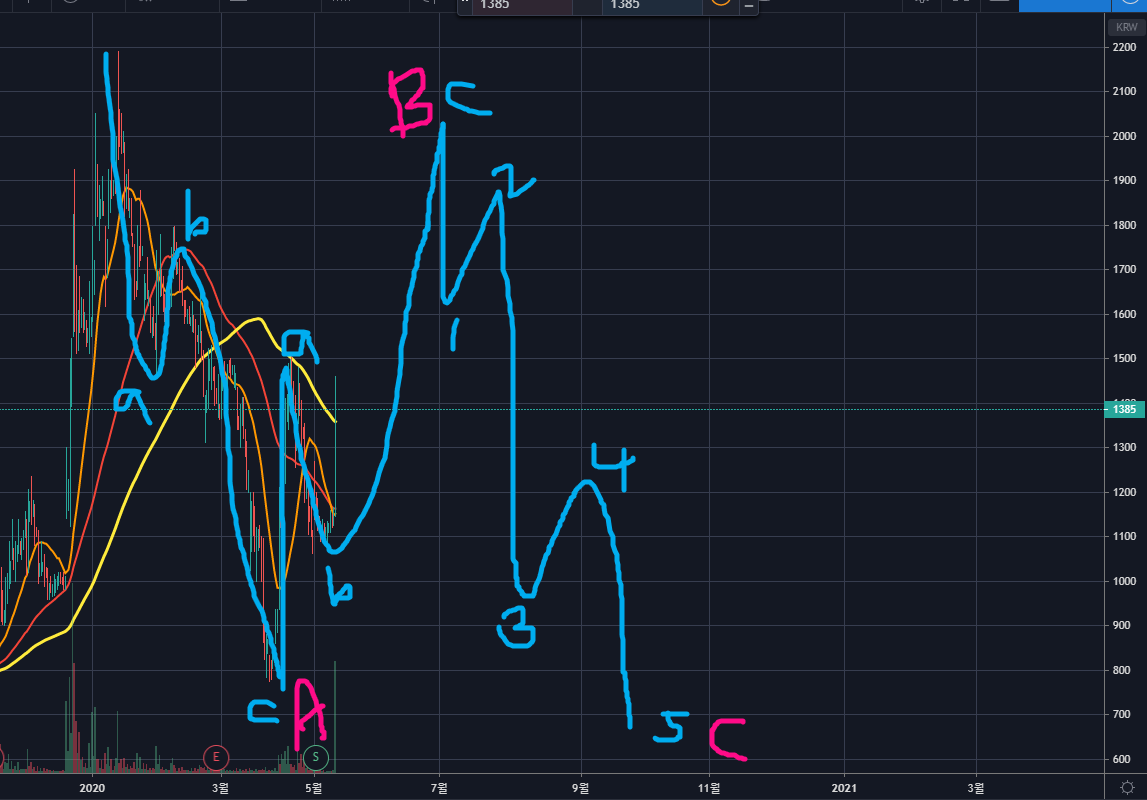 2020년 초에 형성된 2,200부근의 고점을 상회하지 못한다면, 빨간색 C파동처럼 충격파동으로 하락할 것으로 생각되니 빨간색 B에서는 모두 익절하는 것이 좋아보입니다.